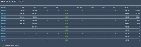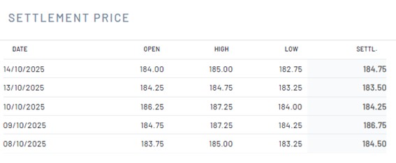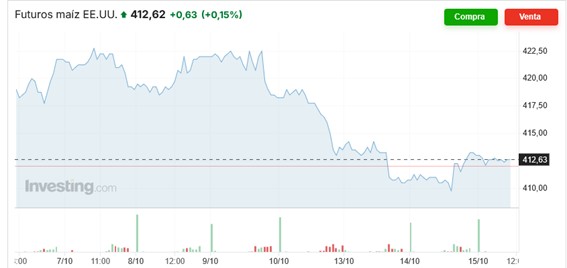 En los futuros del maíz en París, para los contratos de noviembre de 2025, el precio semanal se fijó en 184,75 euros/Tm el 15 de octubre, 0,75 euros más que el 8 de octubre.