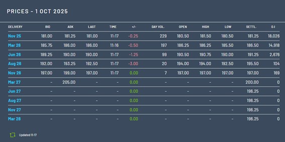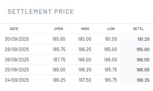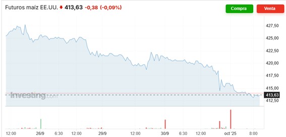 En los futuros del maíz en París, para los contratos de noviembre de 2025, el precio semanal se fijó en 181,25 euros/Tm el 1 de octubre, 4,75 euros menos que el 24 de septiembre.
