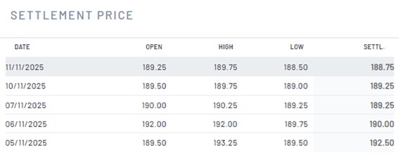 Evolución semanal negativa del maíz en el Euronext, en la que el mercado ha bajado el precio 3,25 euros, desde los 192,5 euros del 5 de noviembre hasta los 188,5 euros/Tm del día 11 de noviembre de 2025.