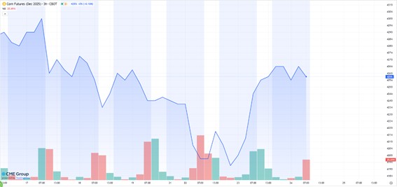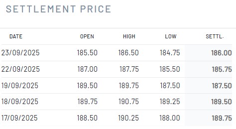 En los futuros del maíz en París, para los contratos de noviembre de 2025, el precio semanal se fijó en 186 euros/Tm el 24 de septiembre, 2,25 euros menos que el 17 de septiembre.