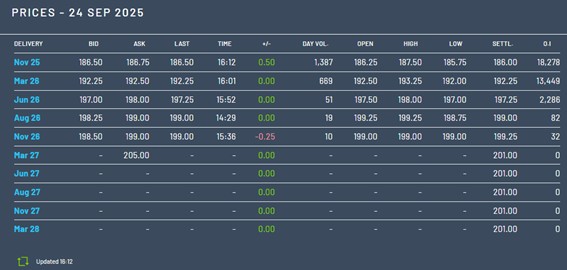 Para los contratos de noviembre de 2026, el precio ha bajado 0,75 euros esta semana, hasta los 199,25 euros/Tm.
